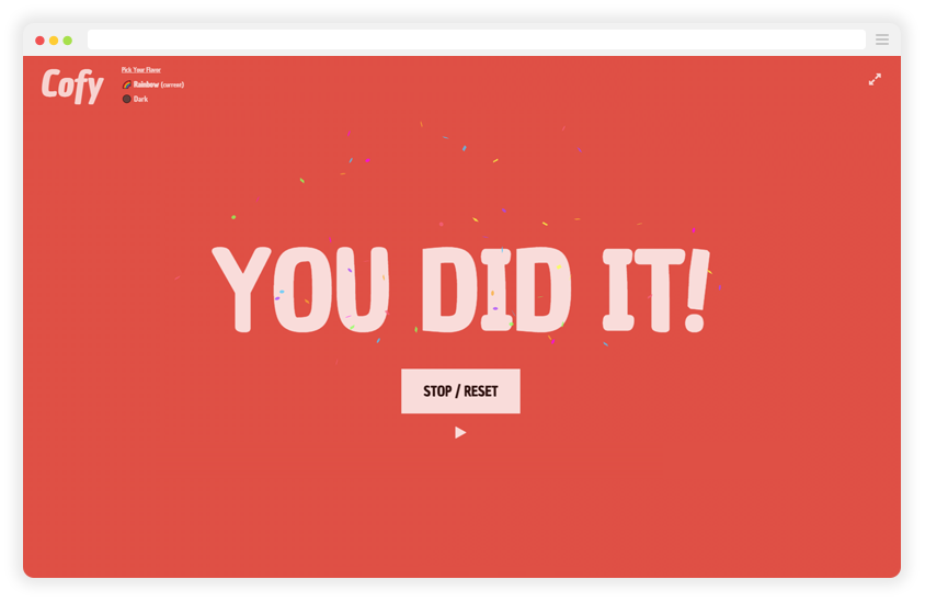 When the timer will run out, you will be notified in the form of a celebration full of confetti. You will now be free to go to your next event you had planned for before starting to work productively using Cofy.