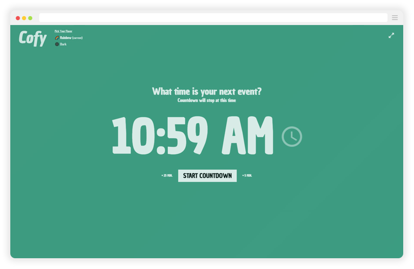 Once the countdown timer is running, you can press Play to start the focus music, and press Next to change the song. To fully stay focused, you can choose to set Cofy fullscreen. After after a few seconds of inactivity, the interface will fade away. If you move your mouse over the interface, it will reappear.